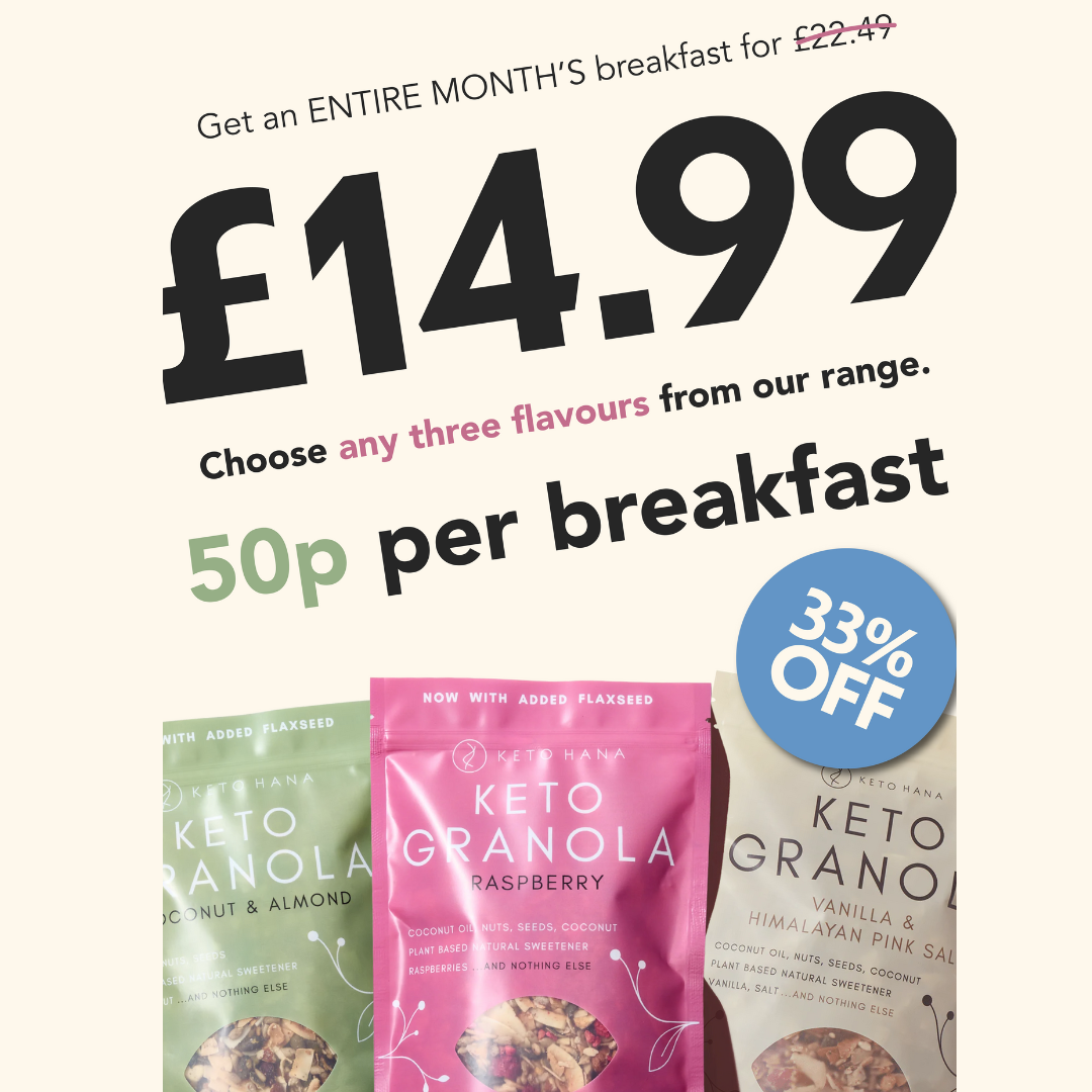 With the 30 Day Breakfast Bundle, you get any 3 of your choice from our 8 ultra-low carb granolas, (all usually 7.49 each), for only £14.99! Only 50p a breakfast, no commitments.