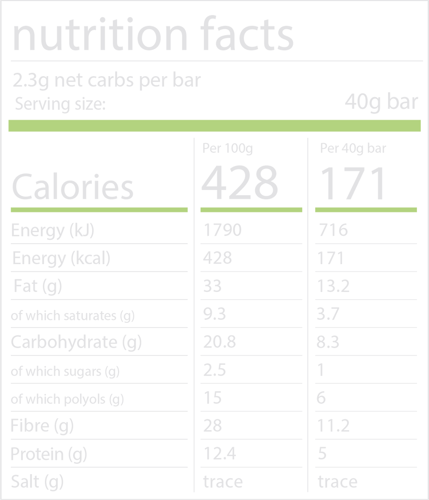 almonds (32%), inulin, natural sweetener (erythritol* & steviol glycosides**), cocoa mass (14%), sunflower seeds, coconut flakes, cocoa powder (3%), pumpkin seeds, flaxseed, peppermint oil