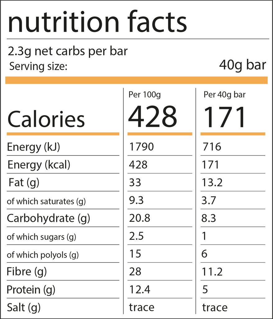 almonds (32%), inulin, natural sweetener (erythritol* & steviol glycosides**), cocoa mass (14%), sunflower seeds, coconut flakes, cocoa powder (3%), pumpkin seeds, flaxseed, orange oil